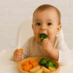 O BLW deve começar por volta dos 6 meses, quando o bebê já consegue sentar com apoio mínimo, sustentar a cabeça firme e demonstra interesse pela comida.